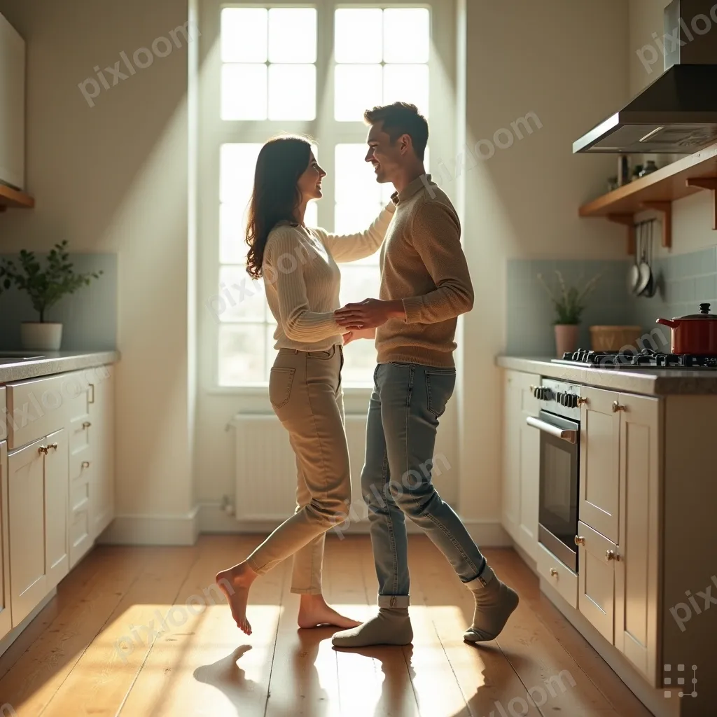 Bright & Airyadults1024x1024Couple dancing in their kitchen, socks on hardwood floor, cooking forgotten on stove, candid