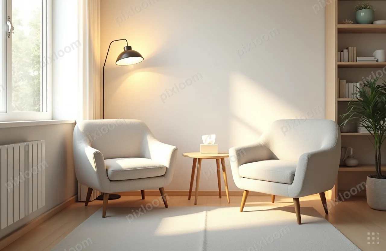 Bright & Airy1280x832Cozy therapy room with two armchairs, warm lamp, tissue box, bookshelf, safe space