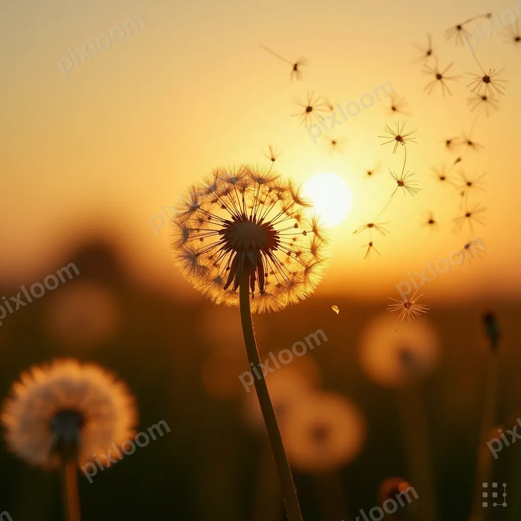 Photorealistic1024x1024Dandelion seeds dispersing in wind against golden sunset sky, letting go and spreading ideas