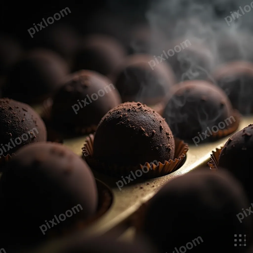 Film Noir1024x1024Dark chocolate truffles arranged in rows, cocoa powder dusted, gold box, luxury presentation