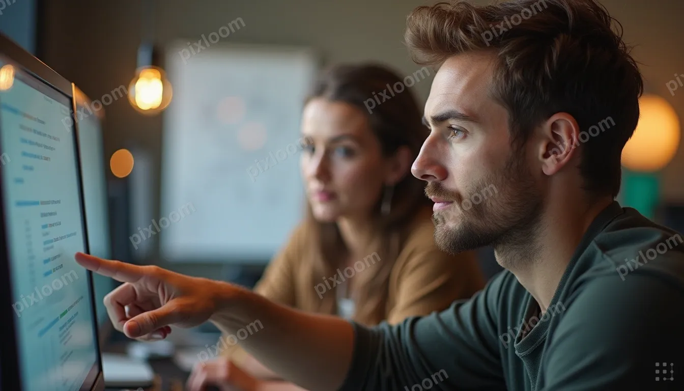 Photorealisticadults1344x768Developer pair programming at a co-working space, one pointing at screen, whiteboard with diagrams behind