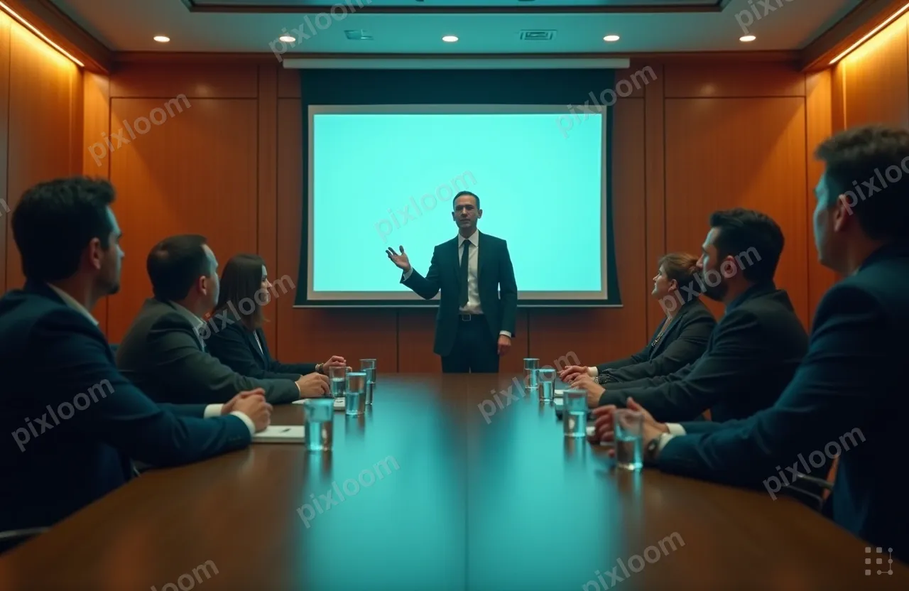 Cinematicadults1280x832Entrepreneur presenting pitch deck to investors, conference room, projection screen, confident stance