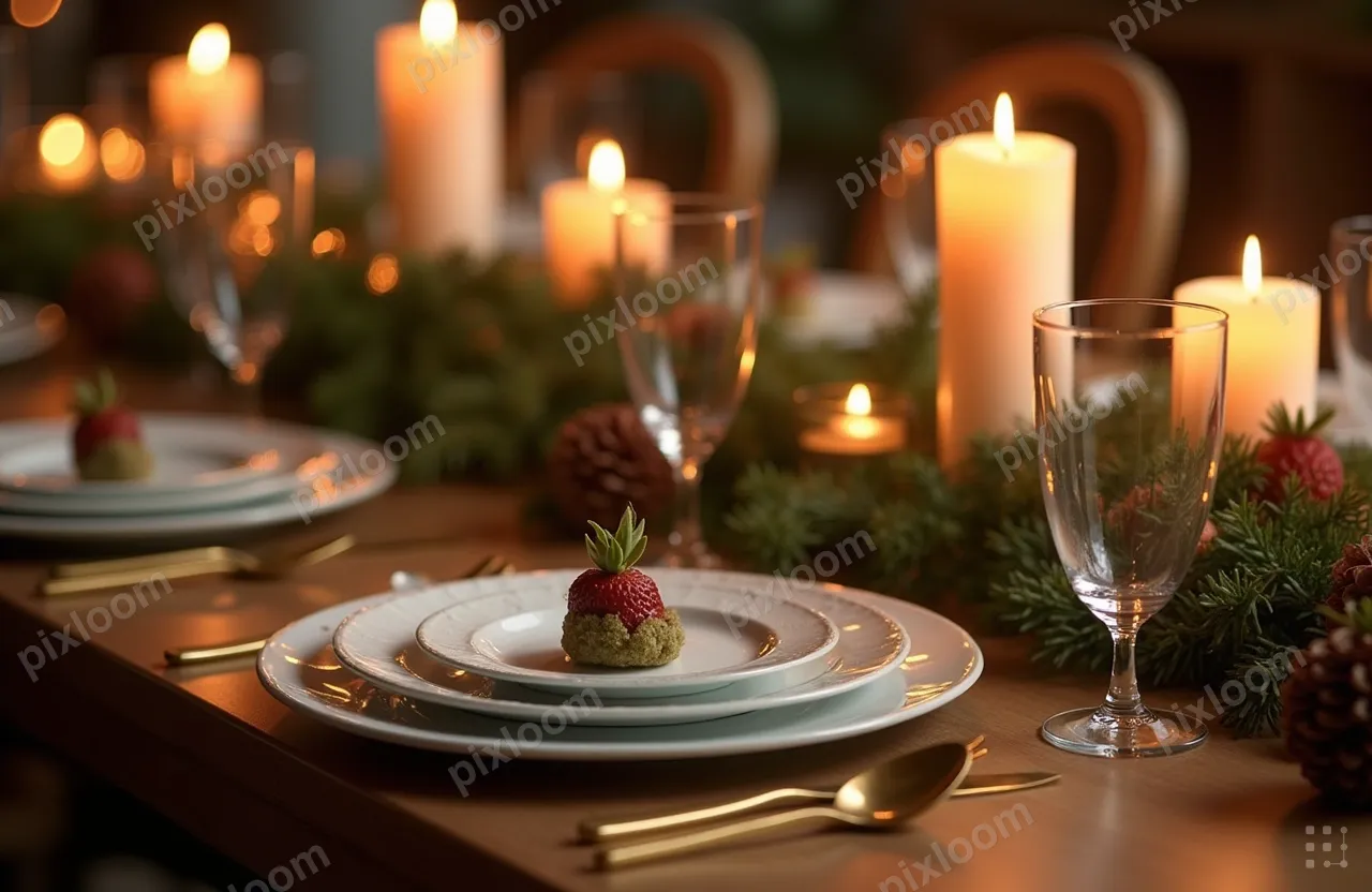 Photorealistic1280x832Festive dinner table set for a holiday meal — candles, greenery, gold cutlery, white plates