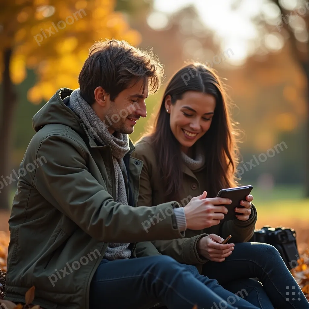 Photorealistic1024x1024Freelance photographer reviewing images on a tablet in a park, camera bag beside them, autumn trees