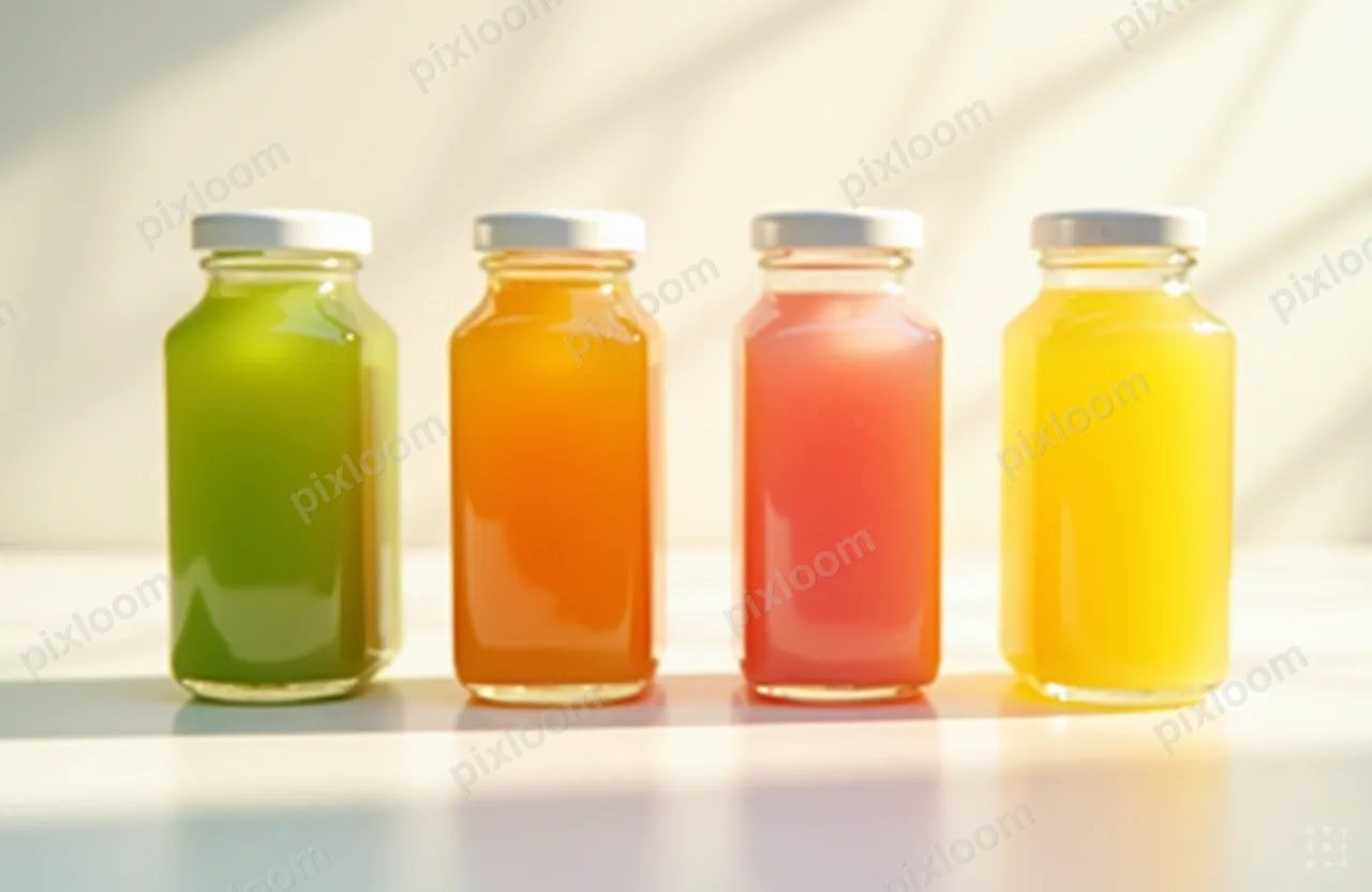 Photorealistic1280x832Fresh juice bottles in a row — green, orange, pink, yellow — on a clean white surface, healthy