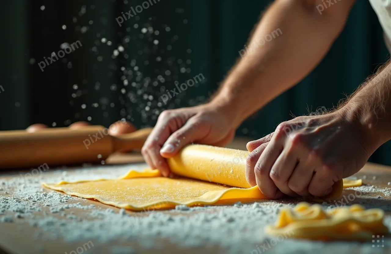 Cinematic1280x832Fresh pasta being rolled by hand, flour-dusted surface, wooden rolling pin, eggs in background