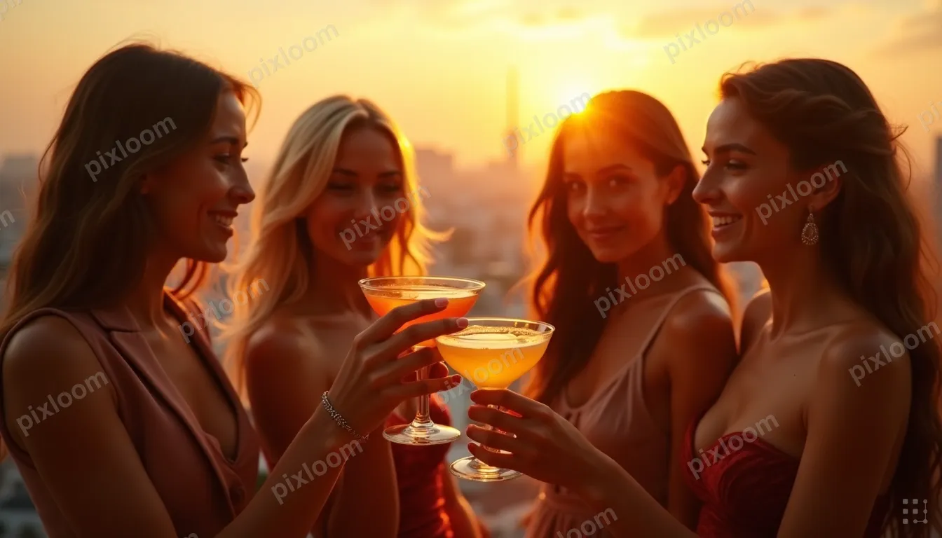 Golden Houradults1344x768Friends clinking cocktail glasses at a rooftop bar, city skyline at sunset, celebration vibe