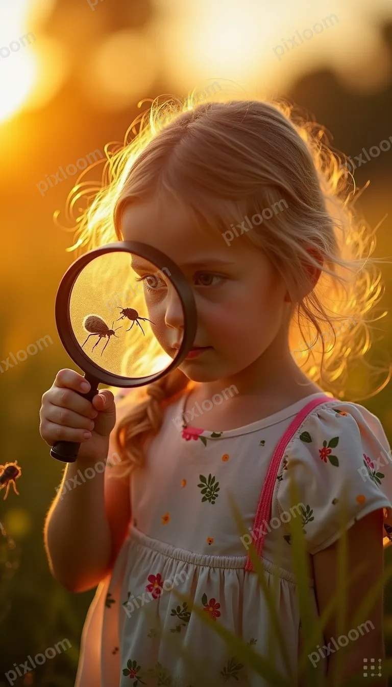 Golden Hourkids768x1344Girl looking through a magnifying glass at bugs in the garden, curious expression, nature explorer