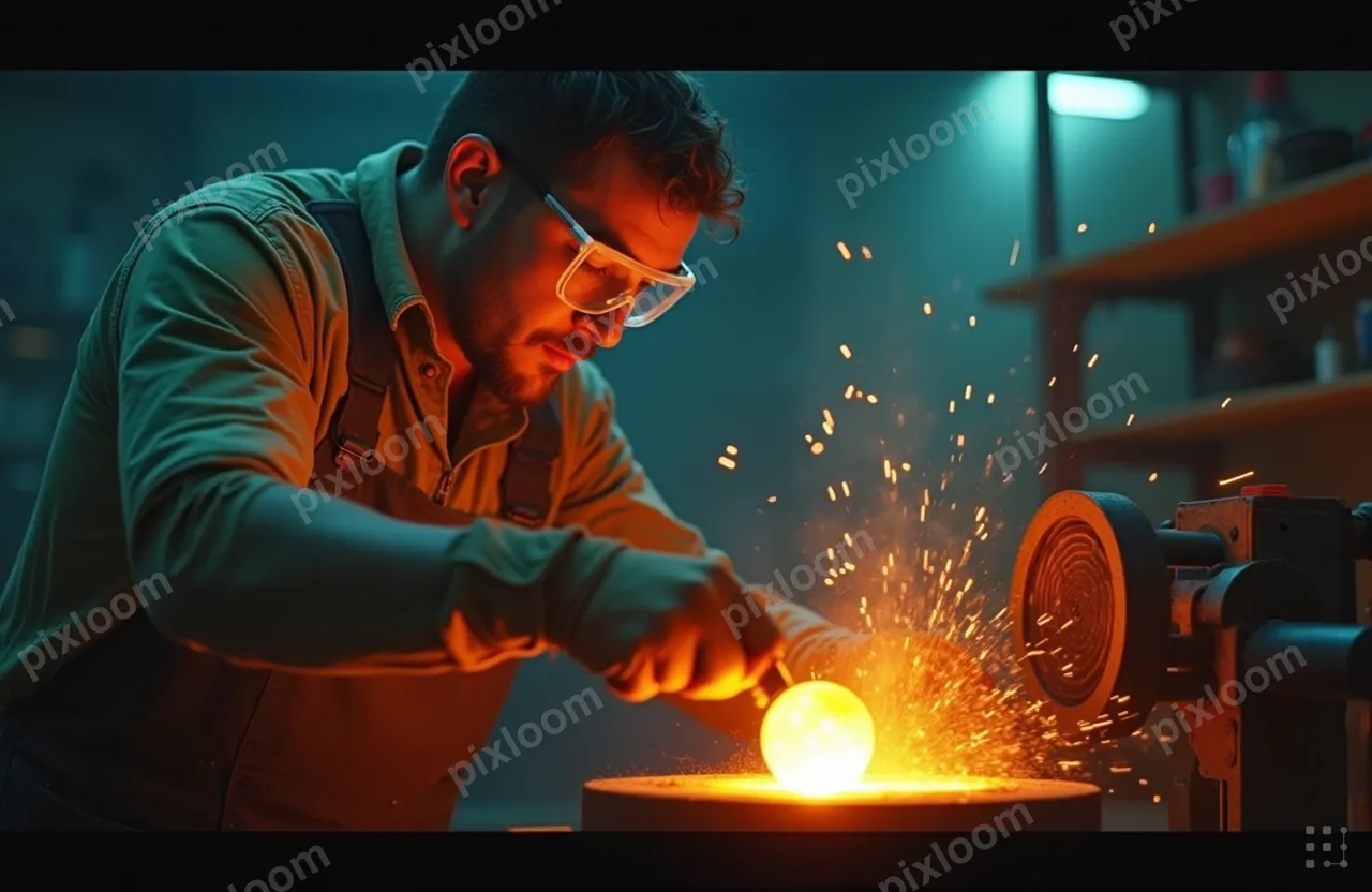 Cinematicadults1280x832Glassblower shaping molten glass, intense orange glow, protective gear, dramatic workshop