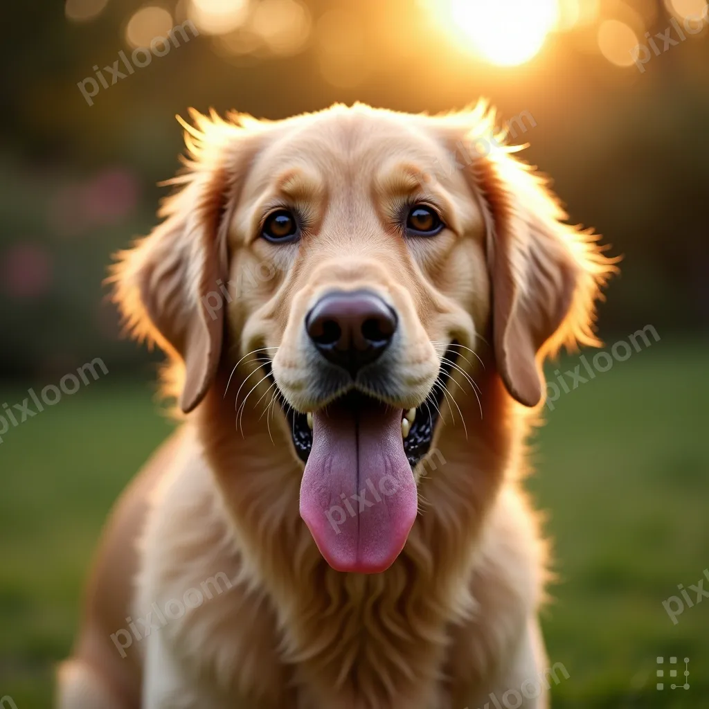 Photorealistic1024x1024Golden retriever portrait, warm eyes, tongue out, soft golden fur, blurred garden background