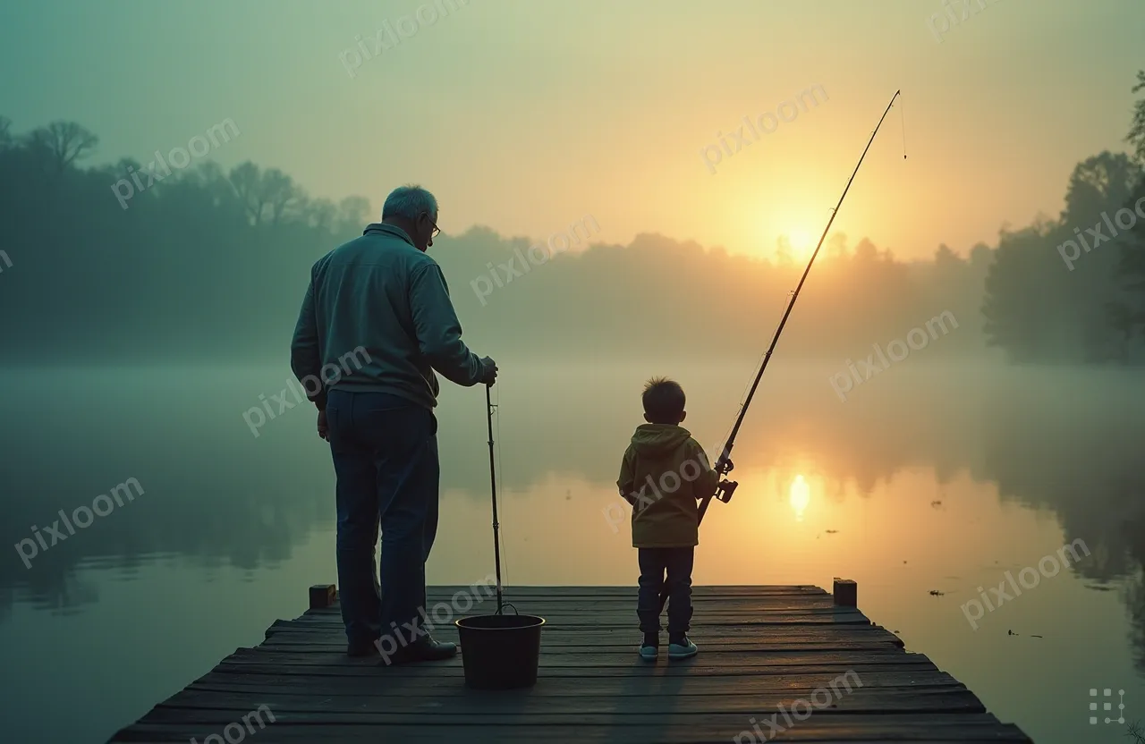 Cinematickids1280x832Grandparent and child fishing at a quiet lake, early morning mist, dock, bucket, peaceful patience