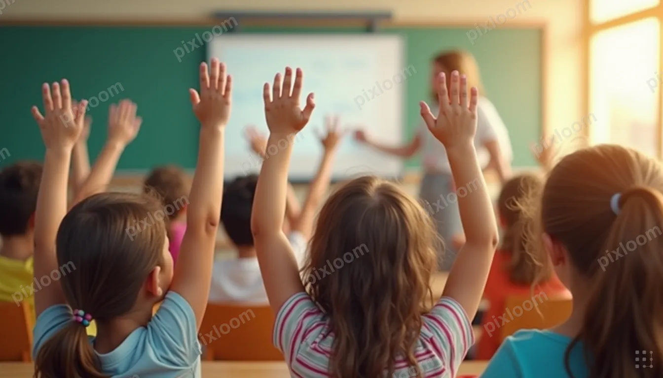 Photorealistickids1344x768Group of diverse elementary students raising hands eagerly, classroom, teacher at whiteboard