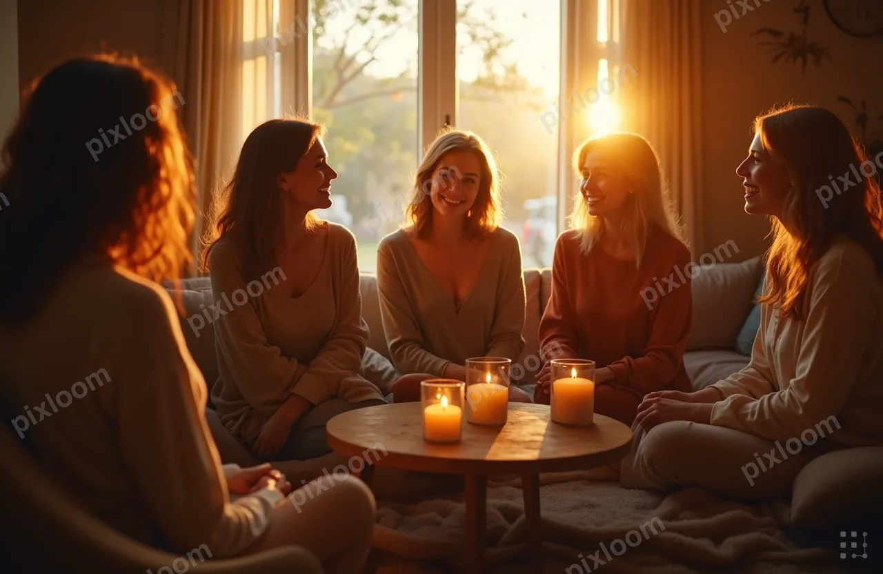 Golden Houradults1280x832Group of women in a support circle, sharing stories, living room, candles, trust