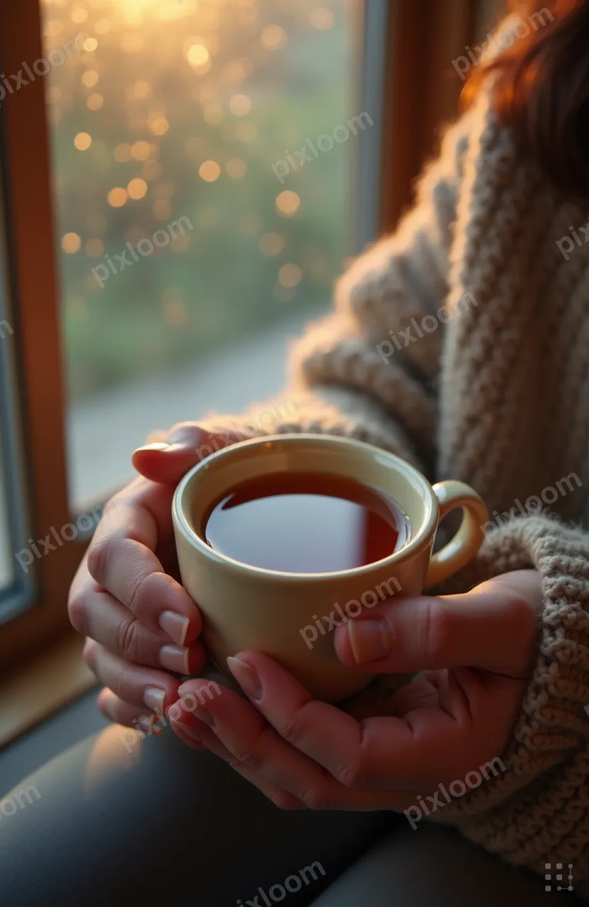 Photorealistic832x1280Hands holding a warm cup of herbal tea, cozy sweater, rainy window in background, peaceful