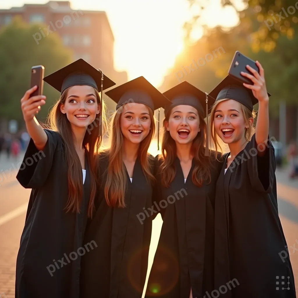Photorealisticbigkids1024x1024High school graduation day, friends taking group selfie, caps and gowns, huge smiles