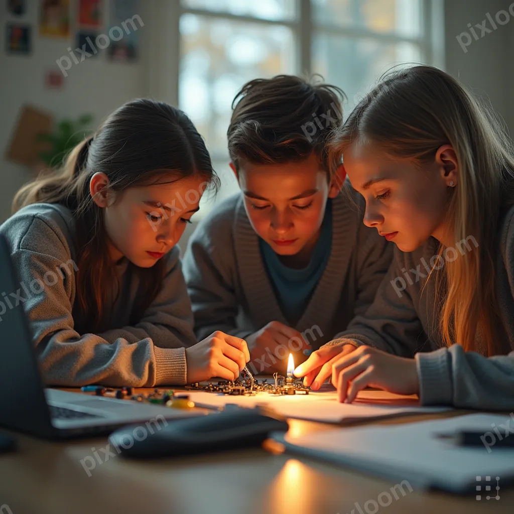 Photorealisticbigkids1024x1024High school students working on a robotics project, circuit boards, laptop, teamwork