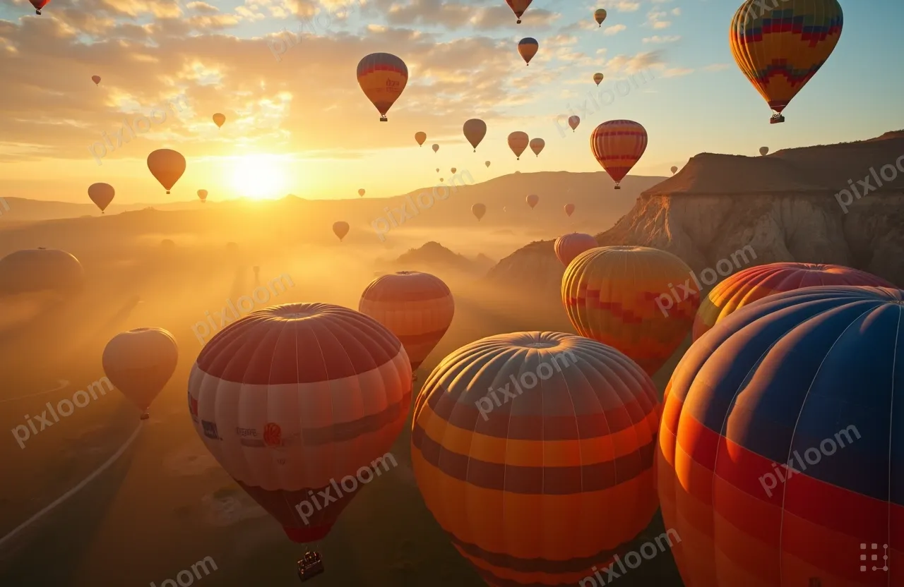 Photorealistic1280x832Hot air balloons floating over a valley at sunrise, colorful balloons, morning mist below