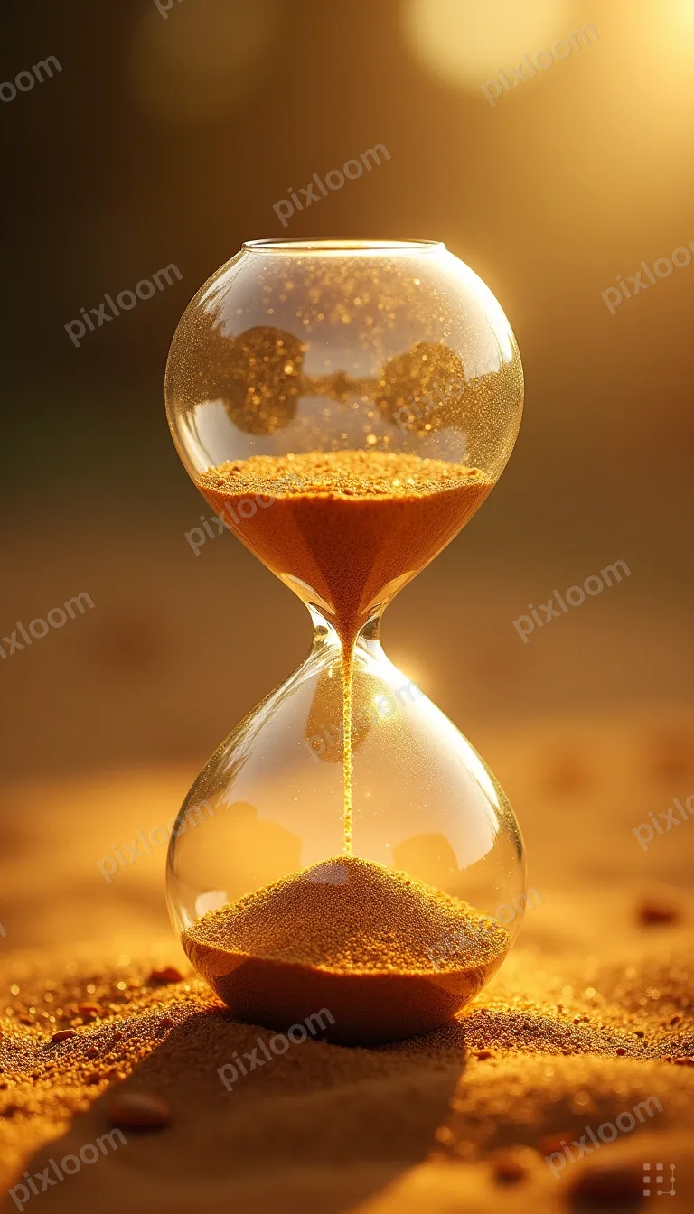 Photorealistic768x1344Hourglass with golden sand flowing, sharp detail on individual grains, soft bokeh background