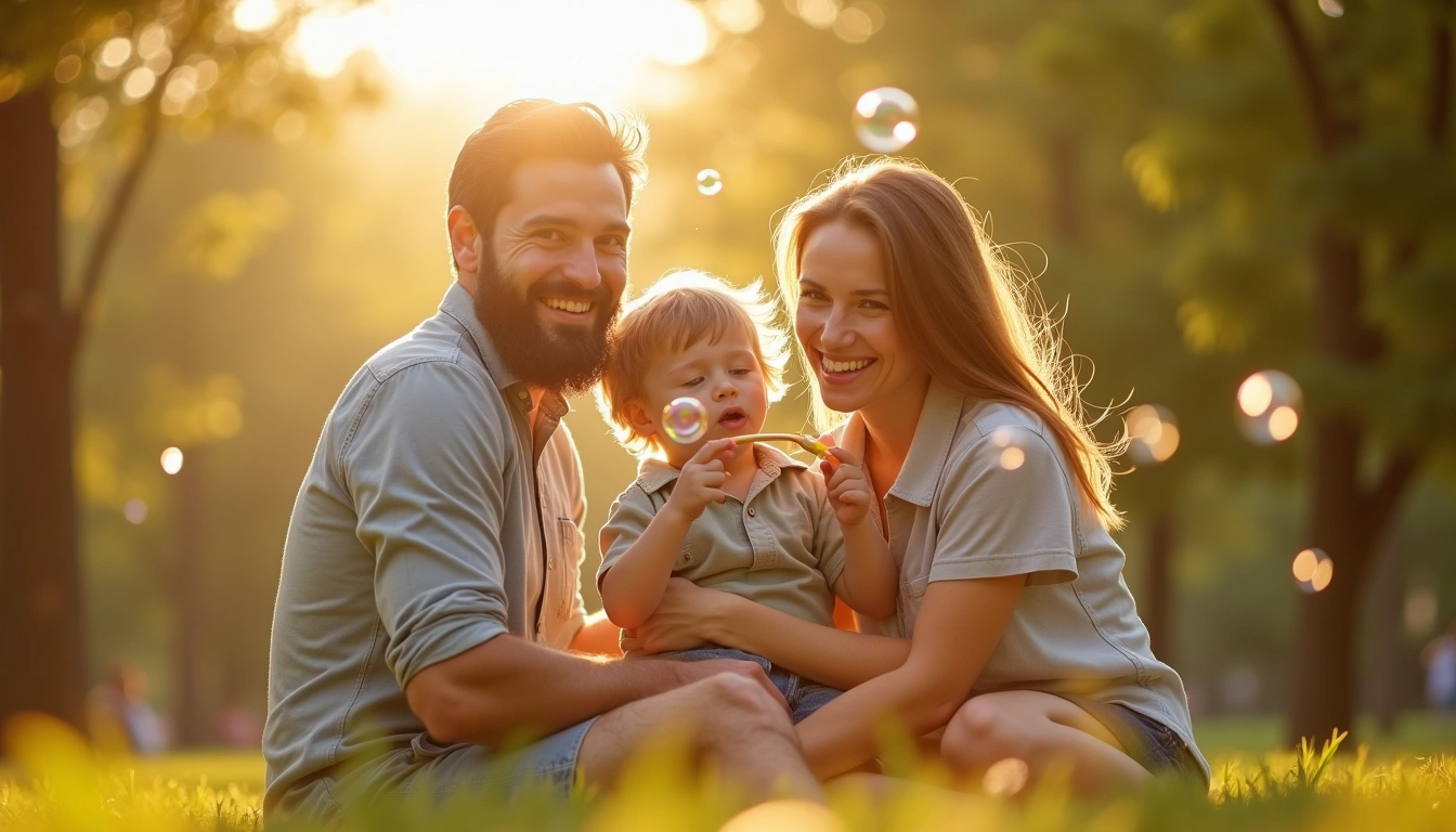 Vintage / Retro1344x768In a sunlit park at eye level, a father with a beard and a mother hug their young child as the child blows bubbles with a bubble wand. Bubbles float around them while trees and a blurred background suggest a warm day. The trio stands close together, smiling at the activity.
