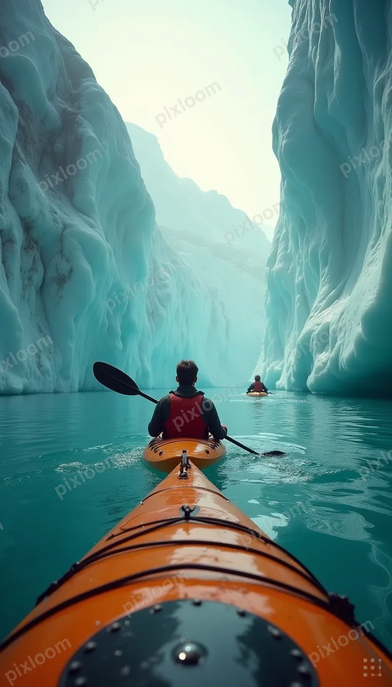 Cinematic768x1344Kayaker on a turquoise glacial river, towering ice walls on both sides, sense of awe and scale