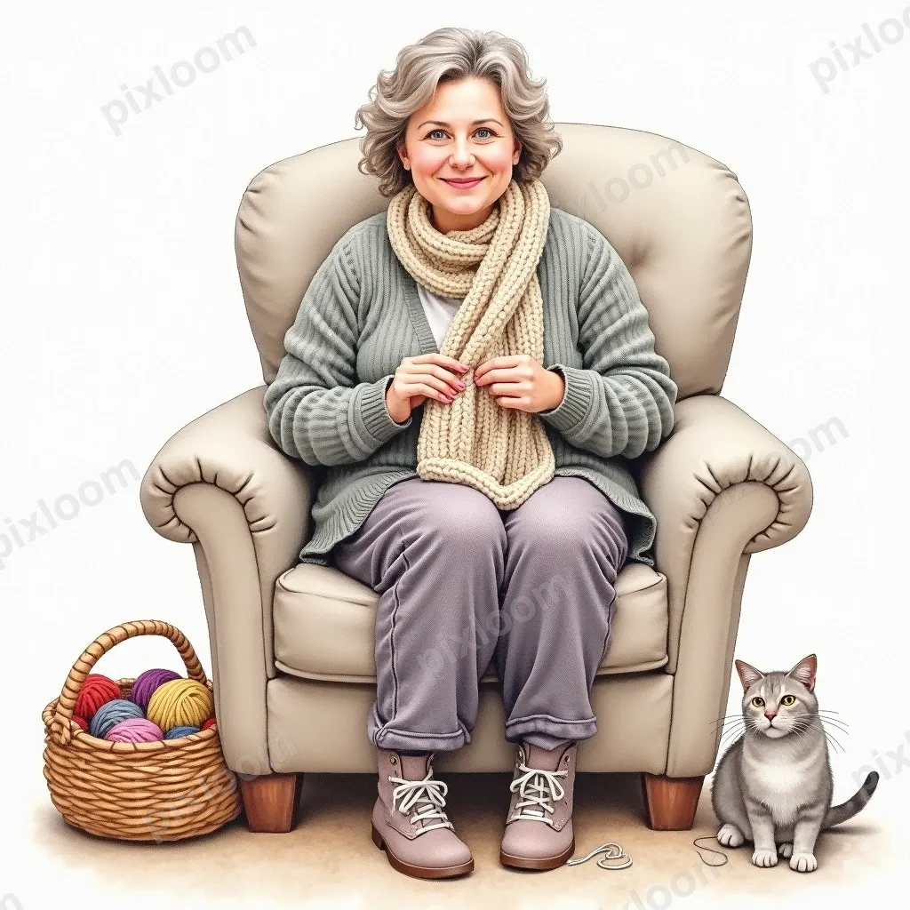Watercoloradults1024x1024Knitter on a cozy armchair, yarn basket beside, half-finished scarf, cat curled up nearby