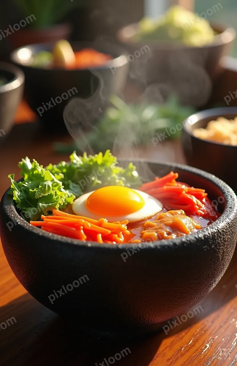 Photorealistic832x1280Korean bibimbap in hot stone bowl, vibrant arranged vegetables, gochujang, egg yolk on top