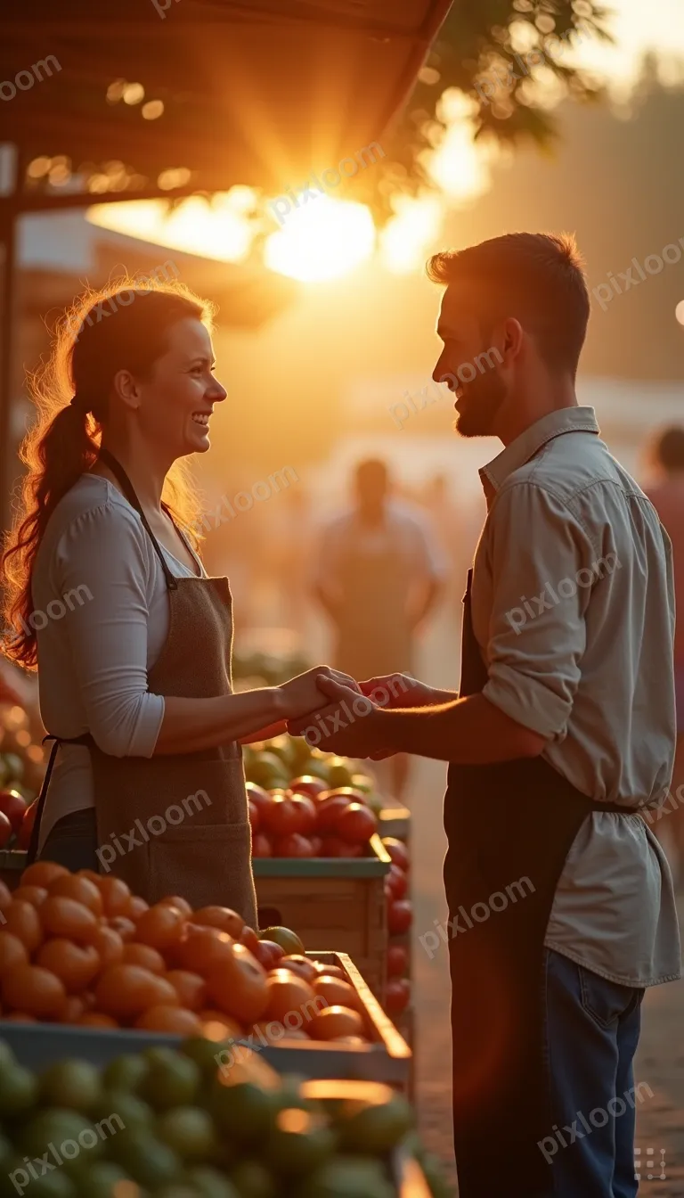 Golden Houradults768x1344Market vendor and customer exchanging produce, genuine smile, connection, morning market