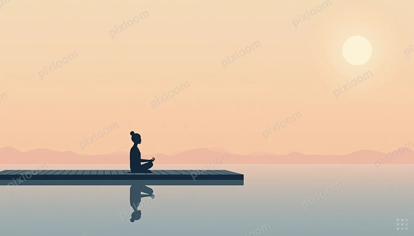 Minimalist1344x768Minimalist silhouette of a person meditating on a dock over still water, dawn sky, vast negative space