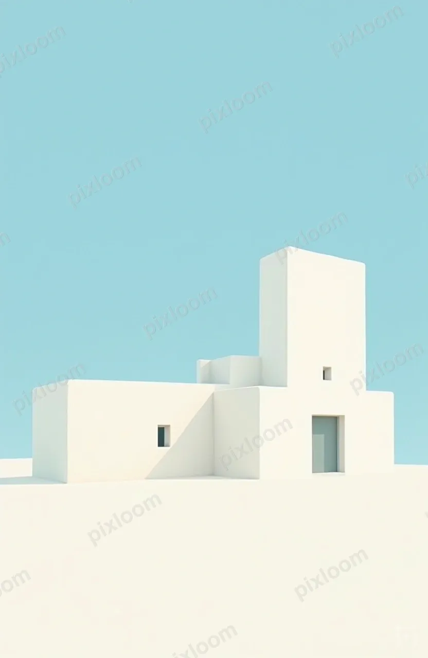 Minimalist832x1280Minimalist white concrete building against clear blue sky, single geometric opening, stark