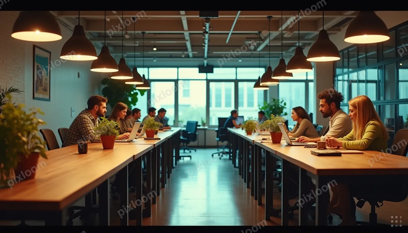 Cinematic1344x768Modern coworking space with long wooden tables, pendant lights, plants, people working