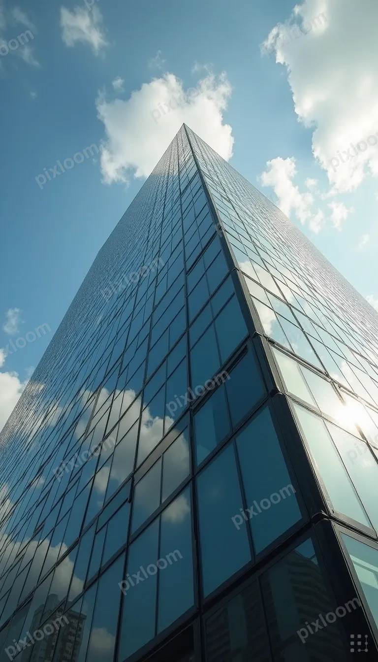 Photorealistic768x1344Modern glass skyscraper facade, geometric reflections of clouds, looking straight up, perspective