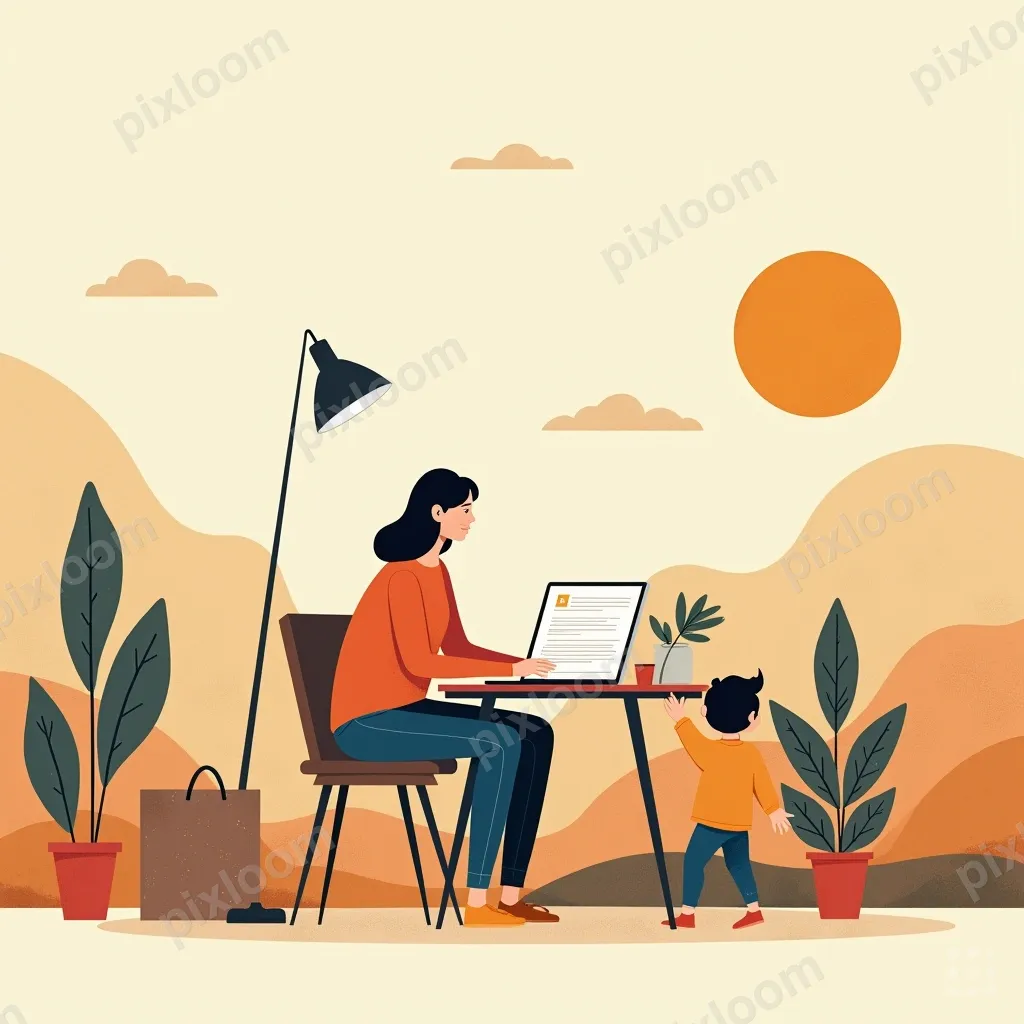Modern Illustrationadults1024x1024Modern illustration of a parent working from home with kids playing around them, split focus, relatable