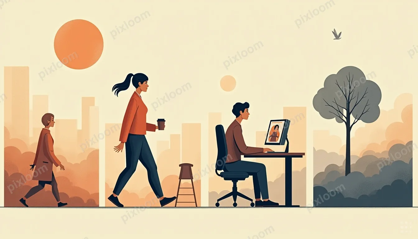 Modern Illustrationadults1344x768Modern illustration of a remote worker's daily routine — morning coffee, standup call, deep work, evening walk — connected timeline