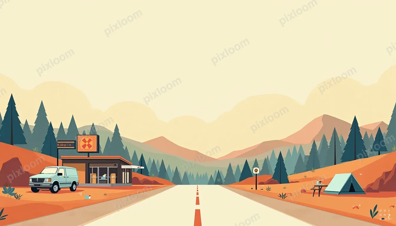 Modern Illustration1344x768Modern illustration of a road trip map with icons — gas station, diner, viewpoint, campsite