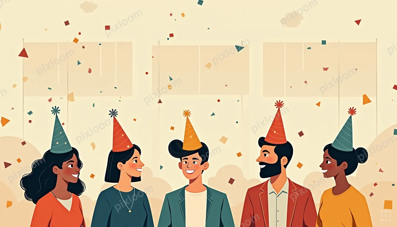 Modern Illustrationadults1344x768Modern illustration of a virtual party — people in video call grid, party hats, confetti, connected remotely