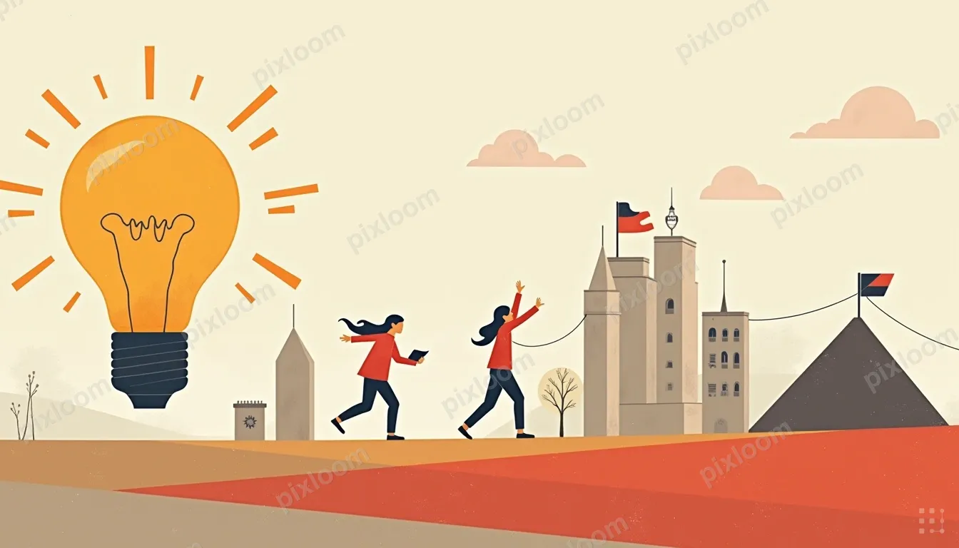 Modern Illustrationadults1344x768Modern illustration of the indie hacker journey — idea lightbulb, building, launching, celebrating — four panel strip