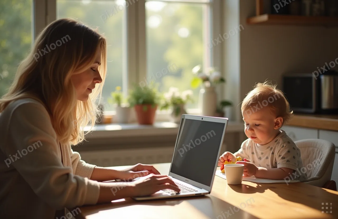 Photorealisticadults1280x832Mom working on laptop at kitchen table while baby plays in high chair nearby, morning coffee, natural light, multitasking