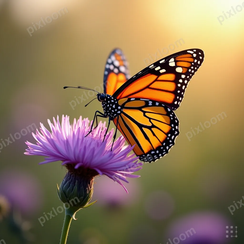 Photorealistic1024x1024Monarch butterfly on a purple wildflower, detailed wing pattern, soft bokeh meadow behind