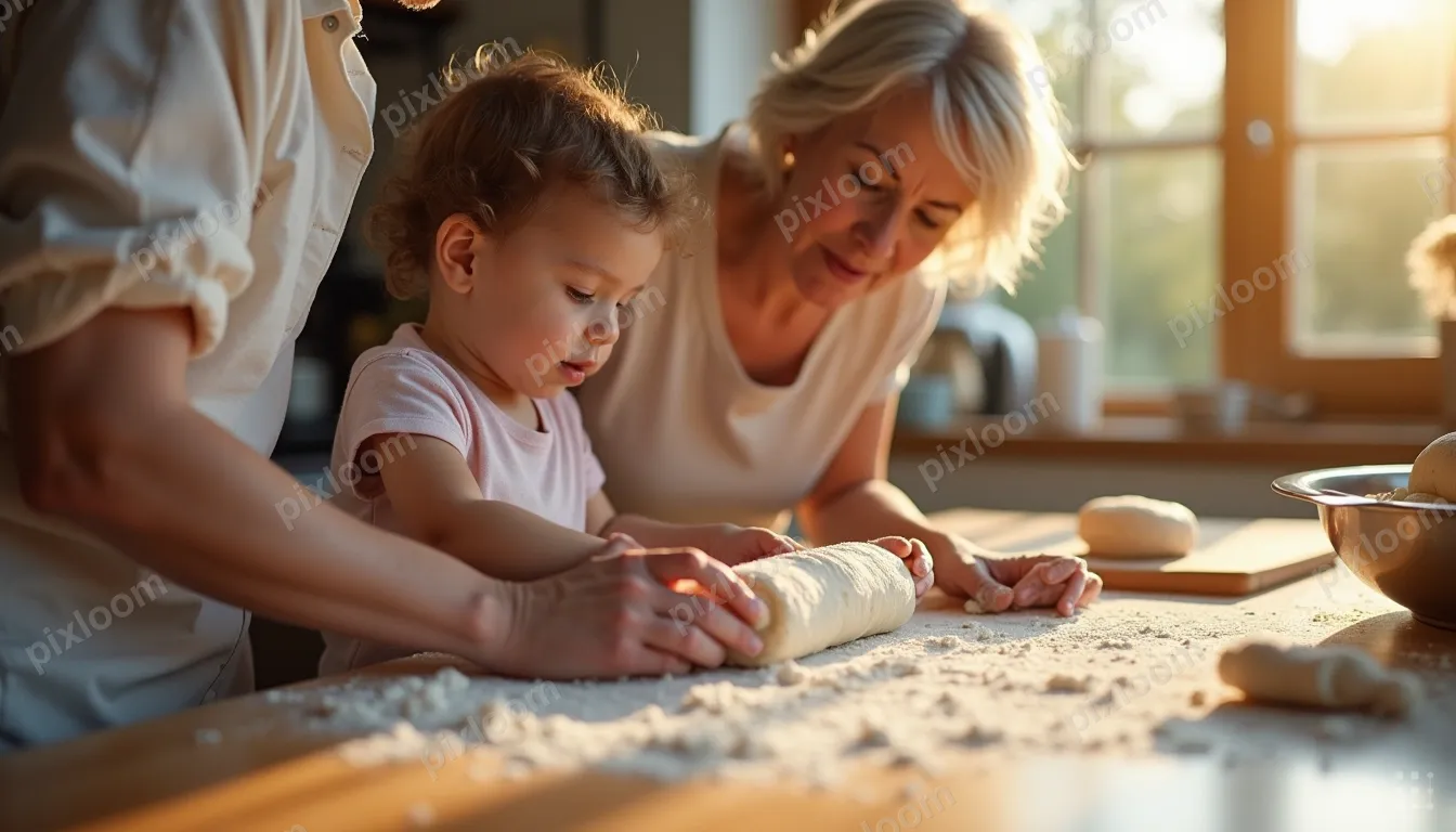 Photorealistickids1344x768Multi-generational family cooking together in a bright kitchen, grandmother showing grandchild how to roll dough, flour-dusted hands