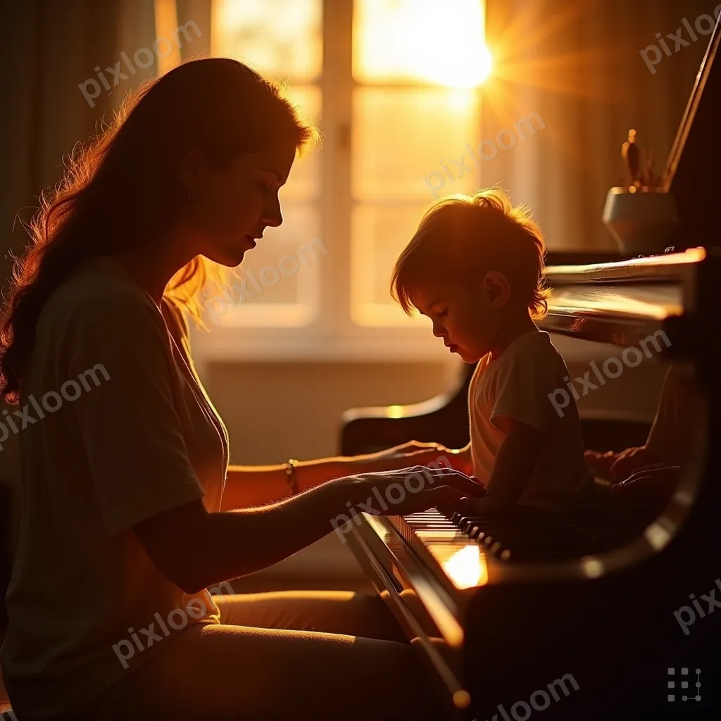 Golden Hourkids1024x1024Music teacher and child at a piano, small hands on keys, patient instruction, warm room