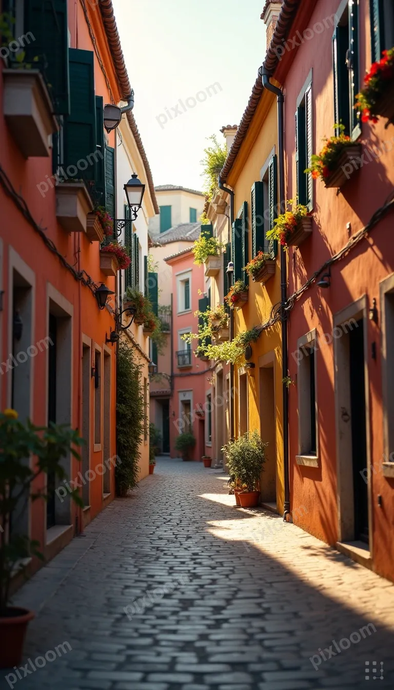 Photorealistic768x1344Narrow European cobblestone alley, colorful facades, hanging laundry, flower boxes, warm light