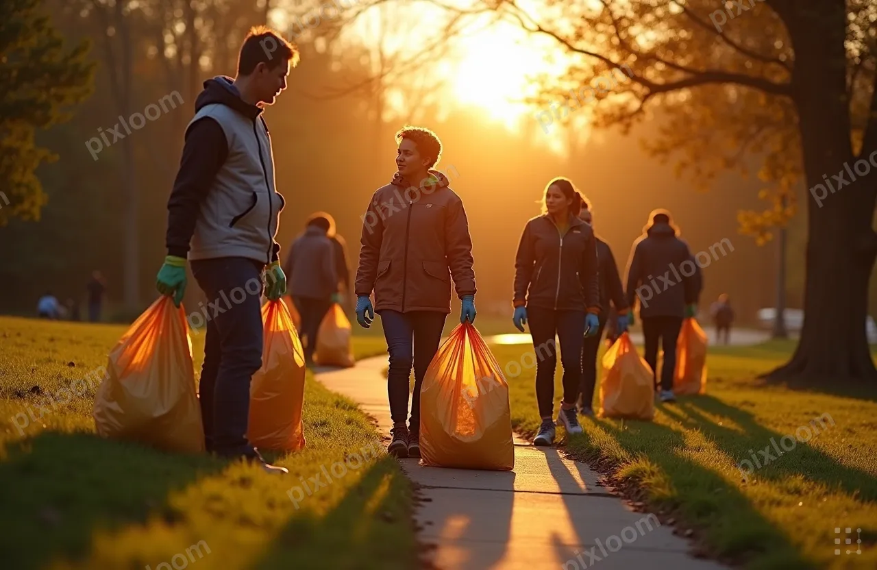 Golden Houradults1280x832Neighborhood cleanup volunteers with trash bags, gloves, community spirit, park setting