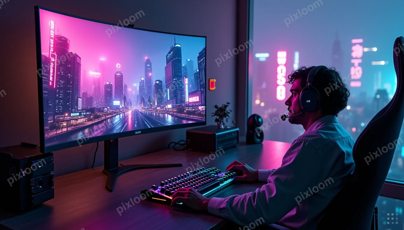 Cyberpunk1344x768Neon-lit gaming setup with RGB keyboard, ultrawide monitor, headphones, dark room
