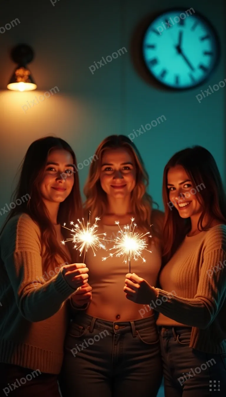 Cinematicadults768x1344New Year's Eve countdown, sparklers in hands, clock approaching midnight, group of friends