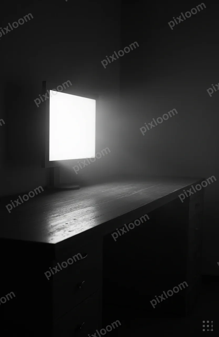 Film Noir832x1280Noir-style dark desk with single glowing screen, ambient light casting long shadows, moody