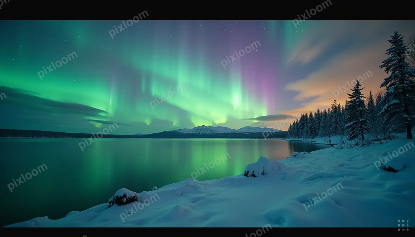 Cinematic1344x768Northern lights over frozen lake, green and purple aurora, snow-covered shoreline, stars