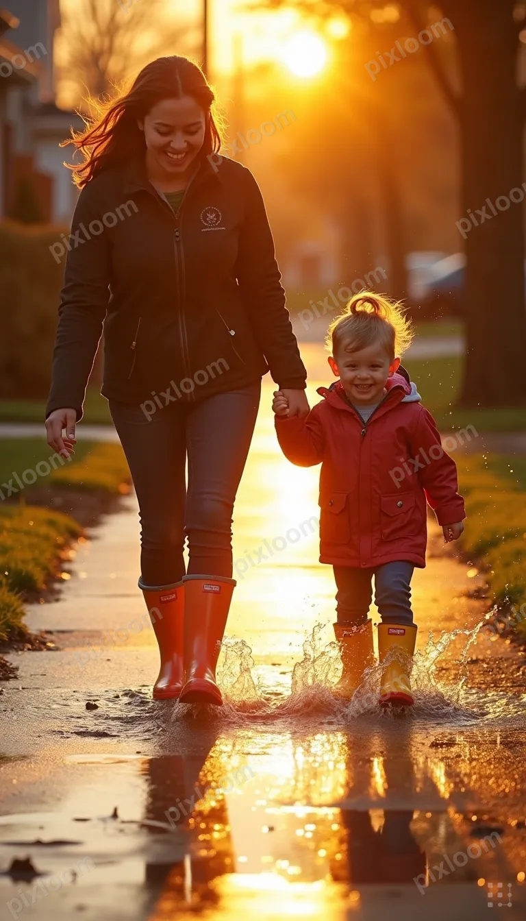 Golden Hourkids768x1344Parent and toddler splashing in rain puddles, colorful rain boots, raincoat, joyful expressions, suburban sidewalk