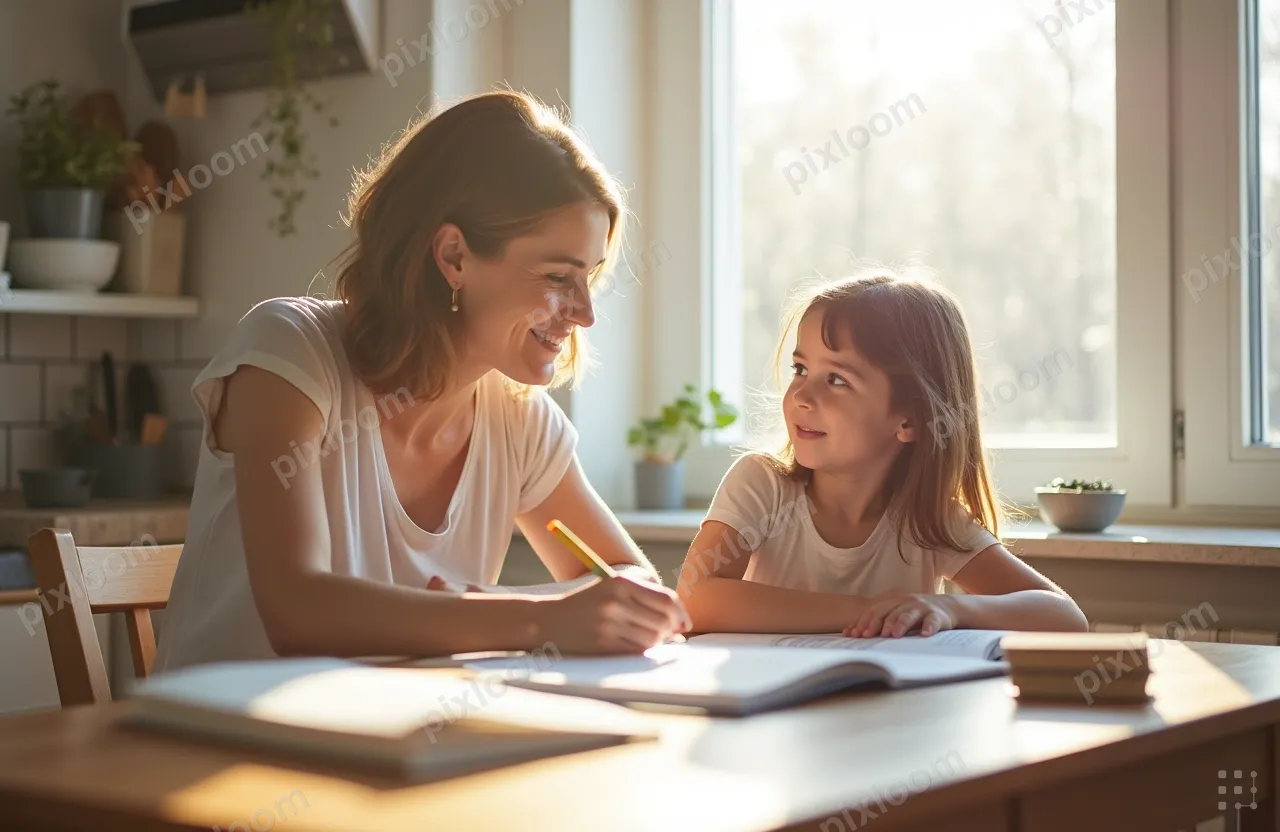Bright & Airykids1280x832Parent helping child with homework at kitchen table, textbooks spread out, patient explanation, warm evening light