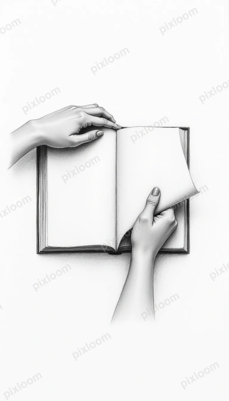 Pencil Sketch768x1344Pencil sketch of hands turning the pages of an open book, detailed crosshatching, scholarly feel