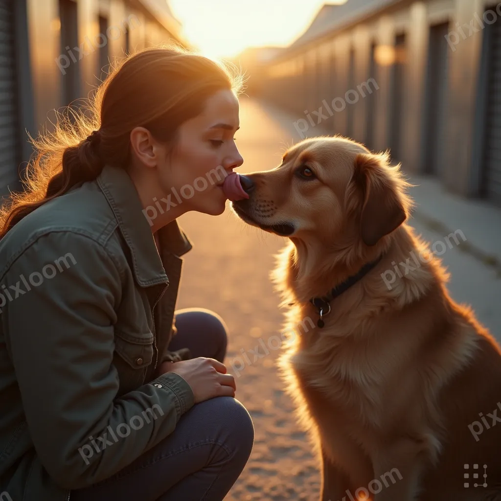 Photorealisticadults1024x1024Person adopting a dog at a shelter, kneeling down, dog licking their face, emotional moment